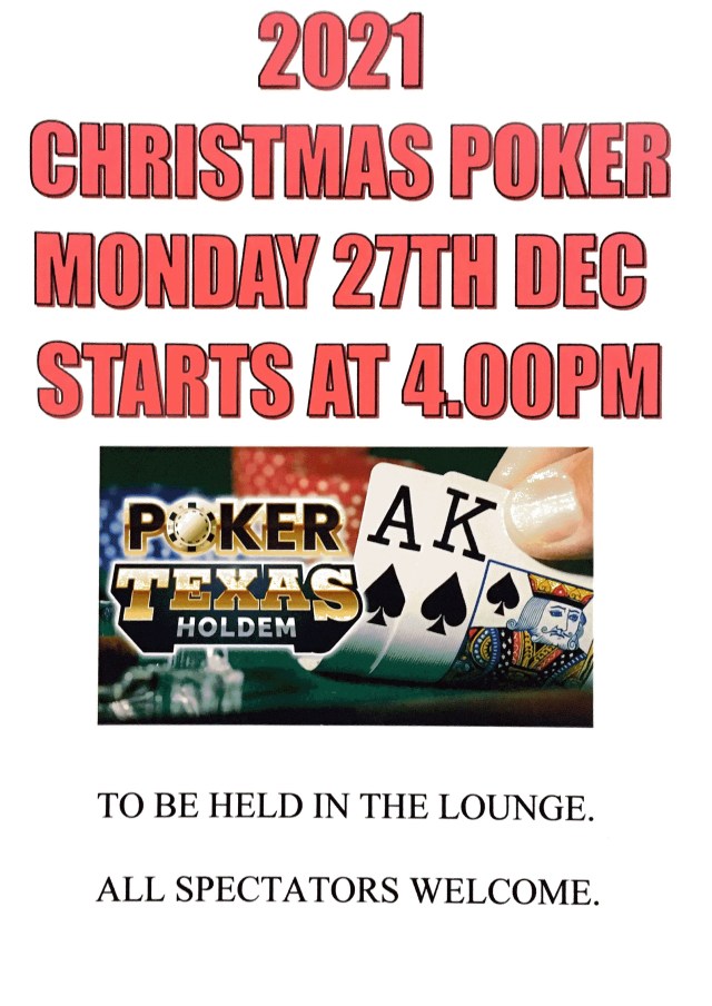 Christmas Poker Tournament On December 13, 2021 By Ian ChristophersonIn General MBC Christmas Poker Tournament: Monday 27th December To be held in the lounge from 4pm, all spectators are welcome. Share this: Click to email a link to a friend (Opens in new window) Email Click to print (Opens in new window) Print Click to share on Facebook (Opens in new window) Facebook Click to share on X (Opens in new window) X Click to share on LinkedIn (Opens in new window) LinkedIn Click to share on WhatsApp (Opens in new window) WhatsApp Like Loading...