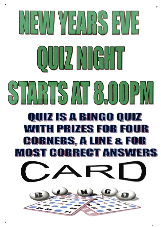 Come and join us for the special New Years Eve edition of Bingo Quiz! Prizes for ’4 corners’, ‘line’, and for the most correct answers! There’ll also be games of ’Card Bingo’ to try your luck at! See you there!