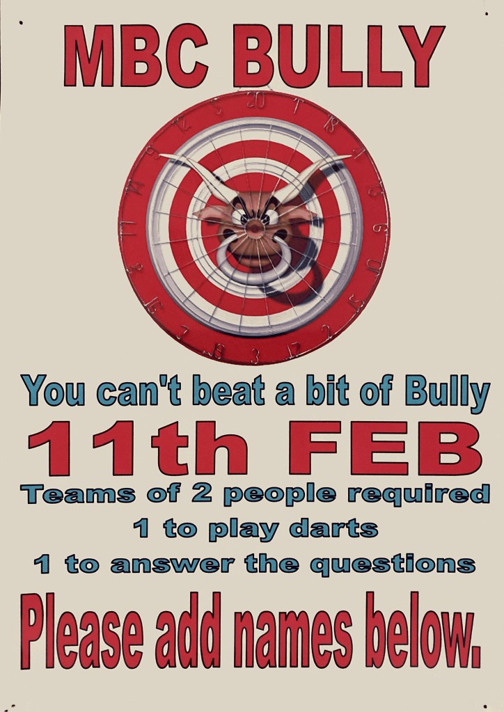 Come and join in for a night of MBC Bully! Based on the popular TV Quiz, compete in teams of 2 players, 1 answering the questions, 1 to throw the darts. Please see the notice board in the club for the entry sheet, or let Tommo know the names of players and team name.