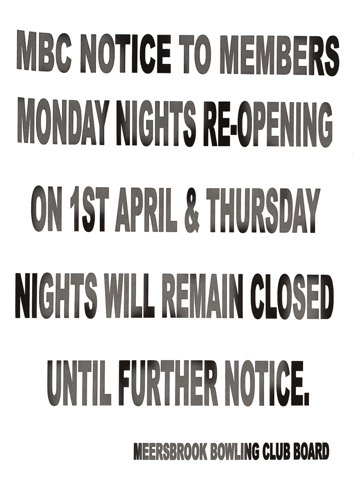 Please note that the club will reopen on Mondays from April 1st. We will monitor Thursday night opening for the time being as attendance at this time last year was poor on Thursdays, but this should be a short wait as we wait for bowls fixtures become known for Thursdays. We will update you as soon as possible.