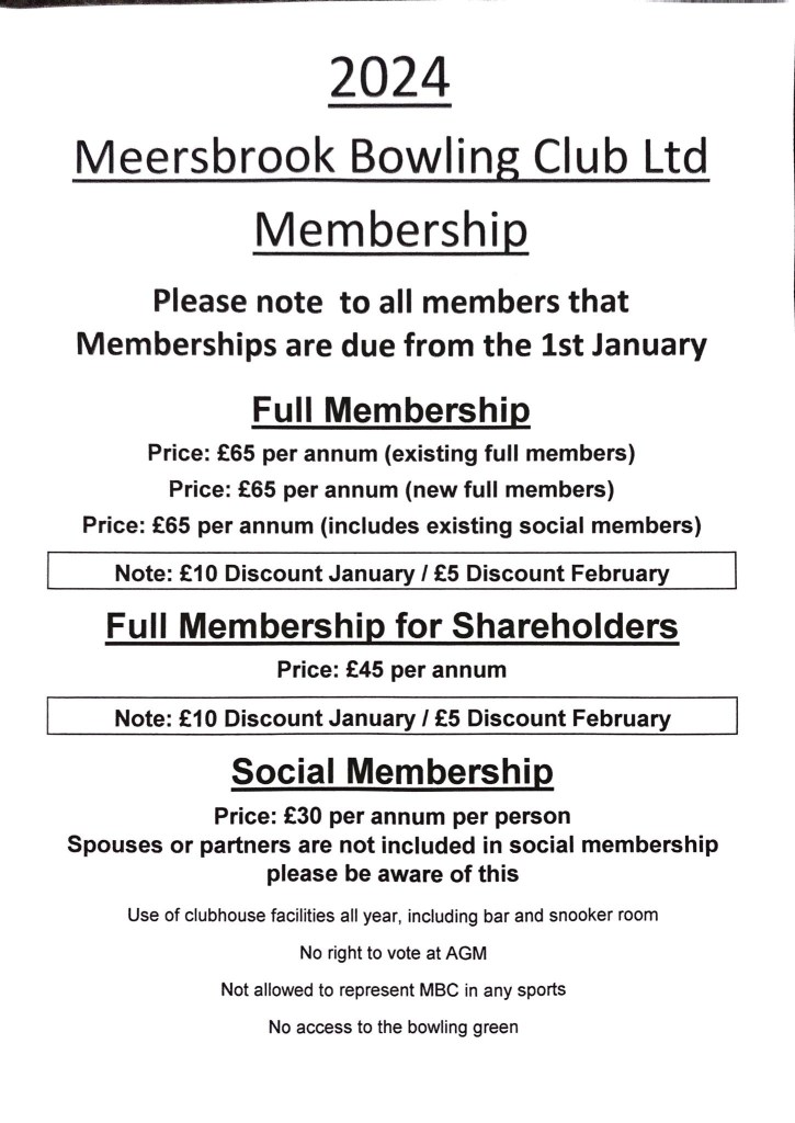 **Please note** that there will be a £10 discount to members and shareholder members paying in January, and a £5 discount to those paying in February. The £10 joining fee for new members has now been waived, and social membership has been discounted by £5 for 2024.