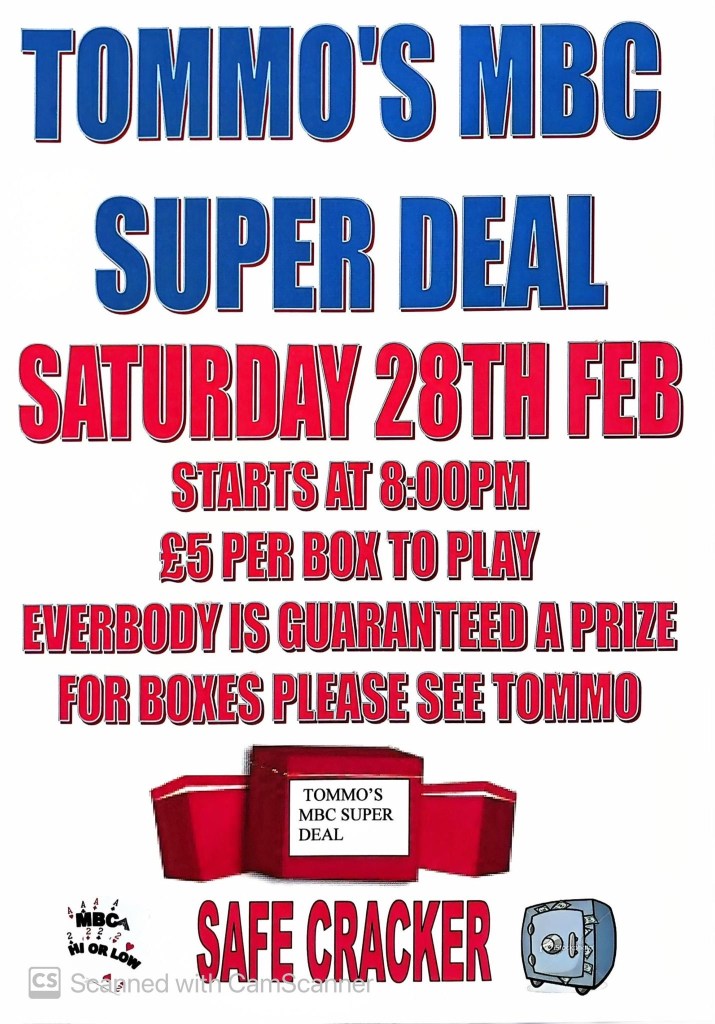 Tommo’s MBC Super Deal Night returns in February! Please come along and support the MBC team, join in the fun and make the night as good as the last one!! £5 per box as usual, see Tommo or notice board for details. Everyone wins a prize! MBC HiLo Cards, Safecracker and Card Bingo as usual after the main event.