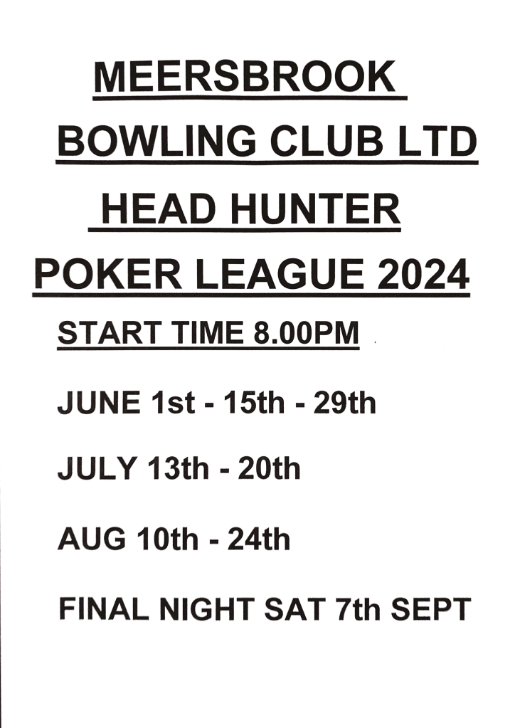 As the 2023 / 2024 Poker League was an even bigger success than usual this time round, we are pleased to be hosting a poker ‘head hunter’ league during the summer and early autumn before the main event returns. Details of dates are below, if you are interested please see Tommo for info.